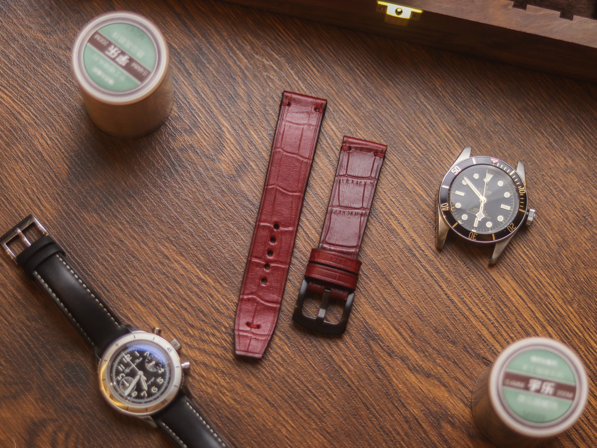 BURGUNDY CROCO HAND-CRAFTED WATCH STRAPS - MINIMAL STITCHED U-TAIL
