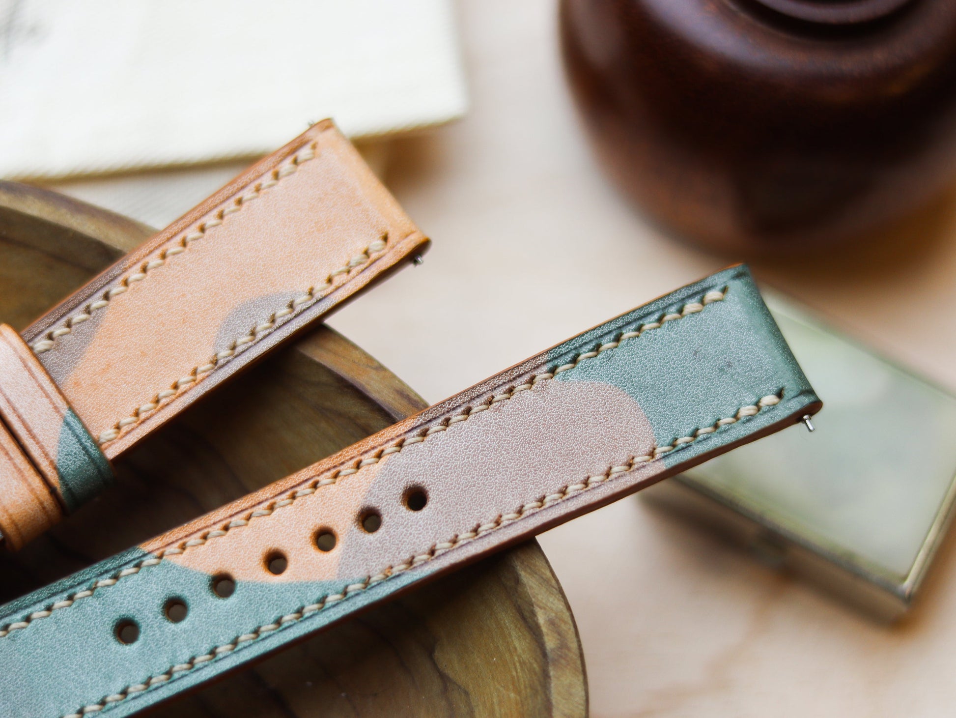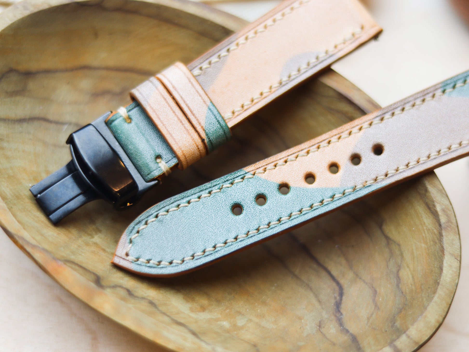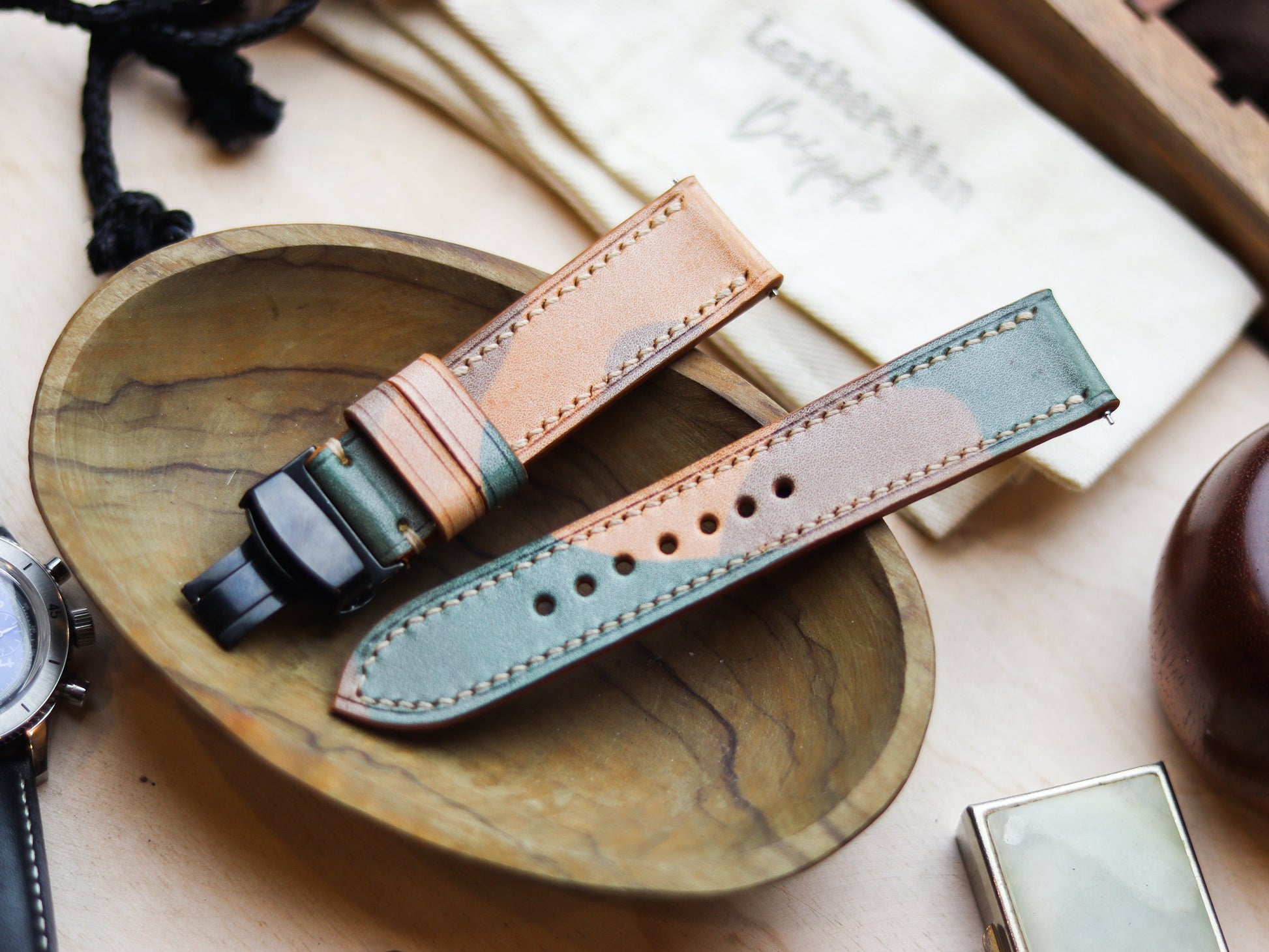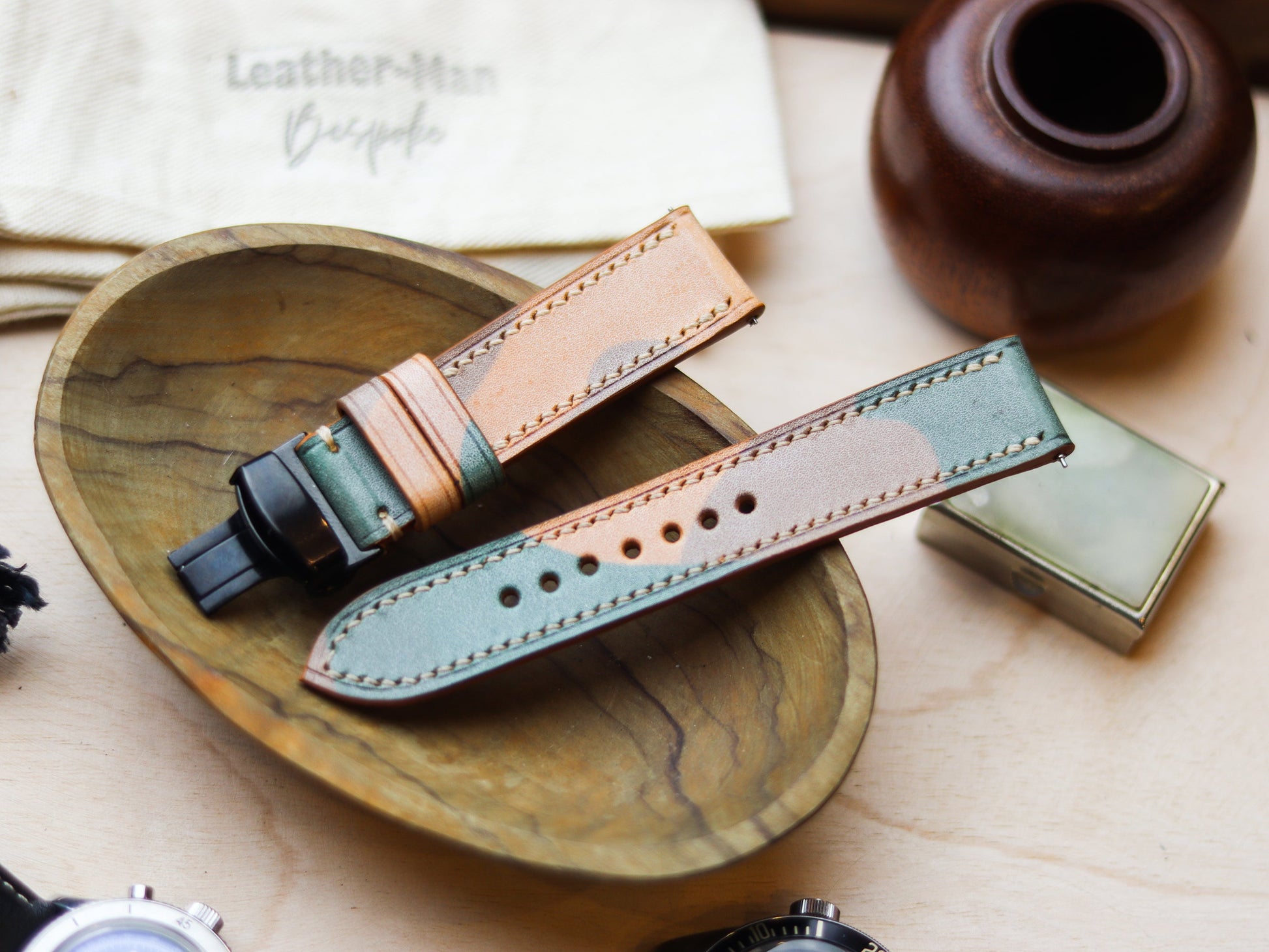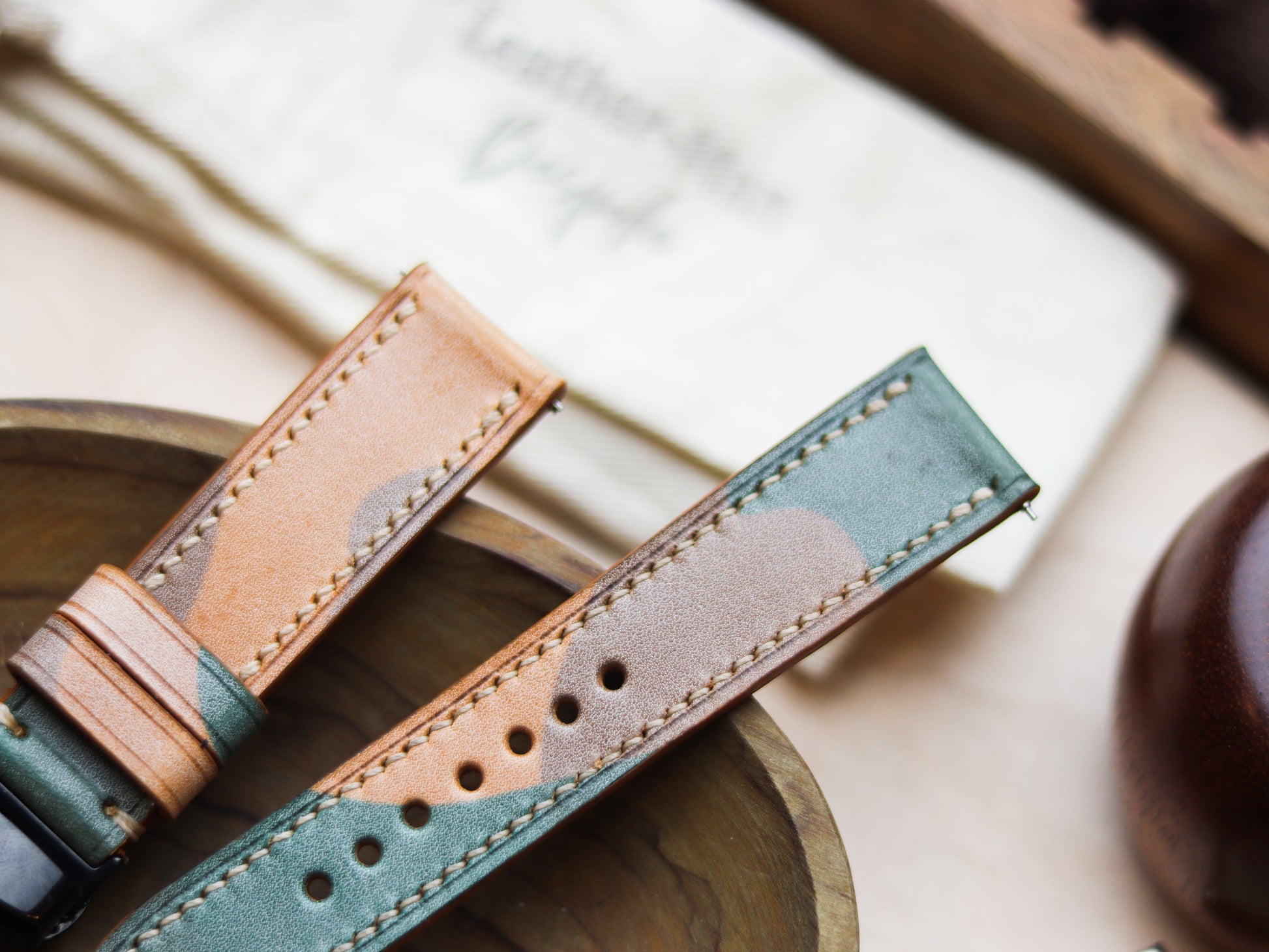 This exquisite handcrafted leather watch strap has a sleek and urban edge. Crafted from Premium Italian Waxed Camouflage Leather with precision and a passion for exceptional good looks. This leather and design blends urban sophistication with an enigmatic allure. The leather is smooth and ensures a comfortable fit. Elevate your wrist game.