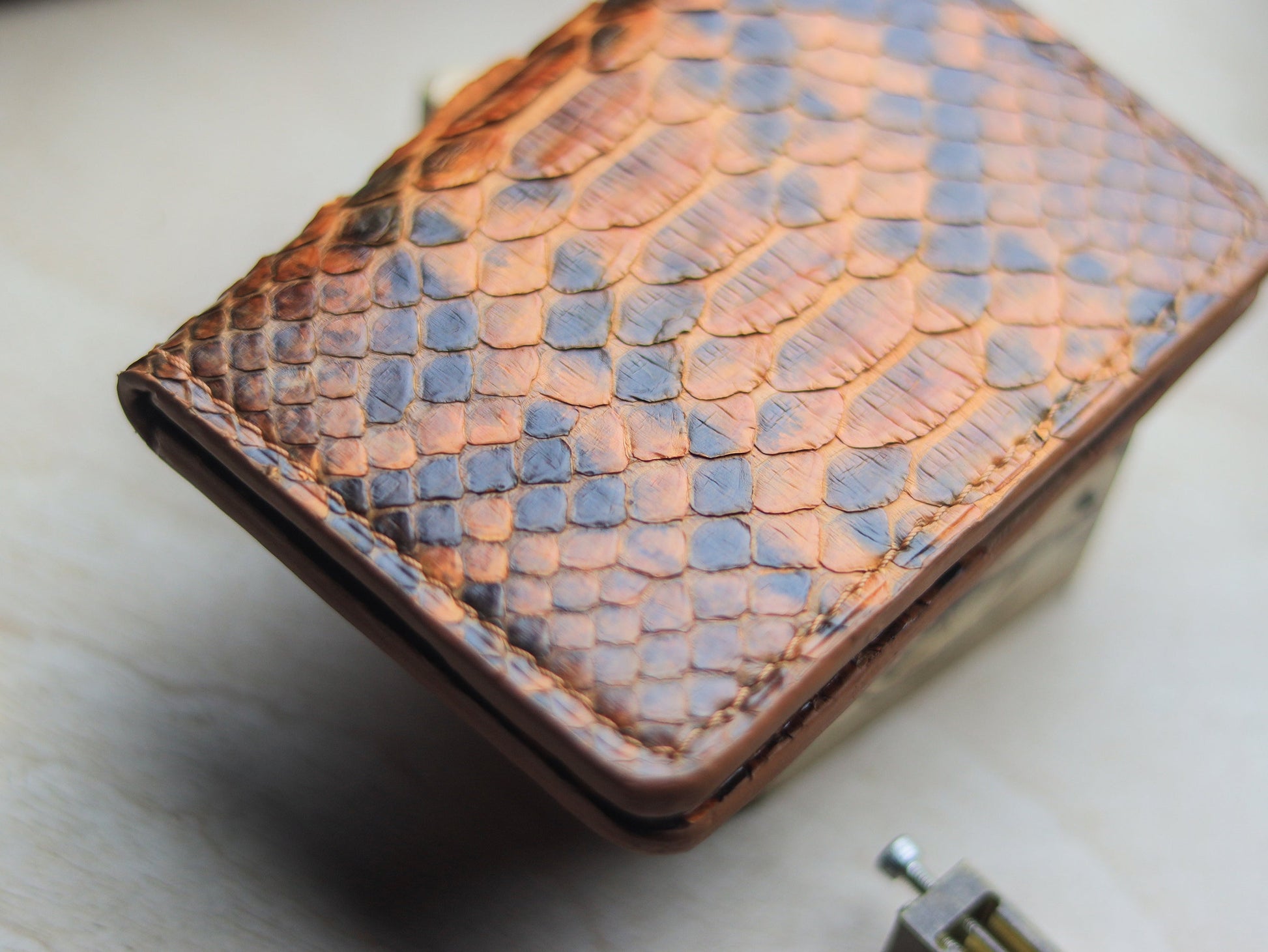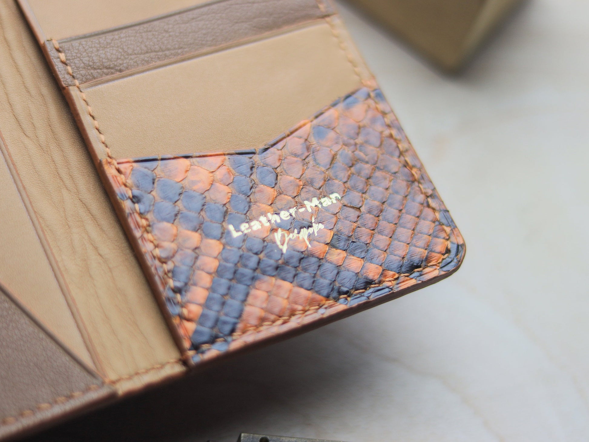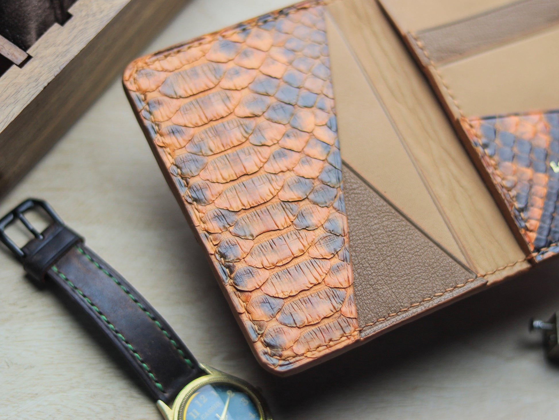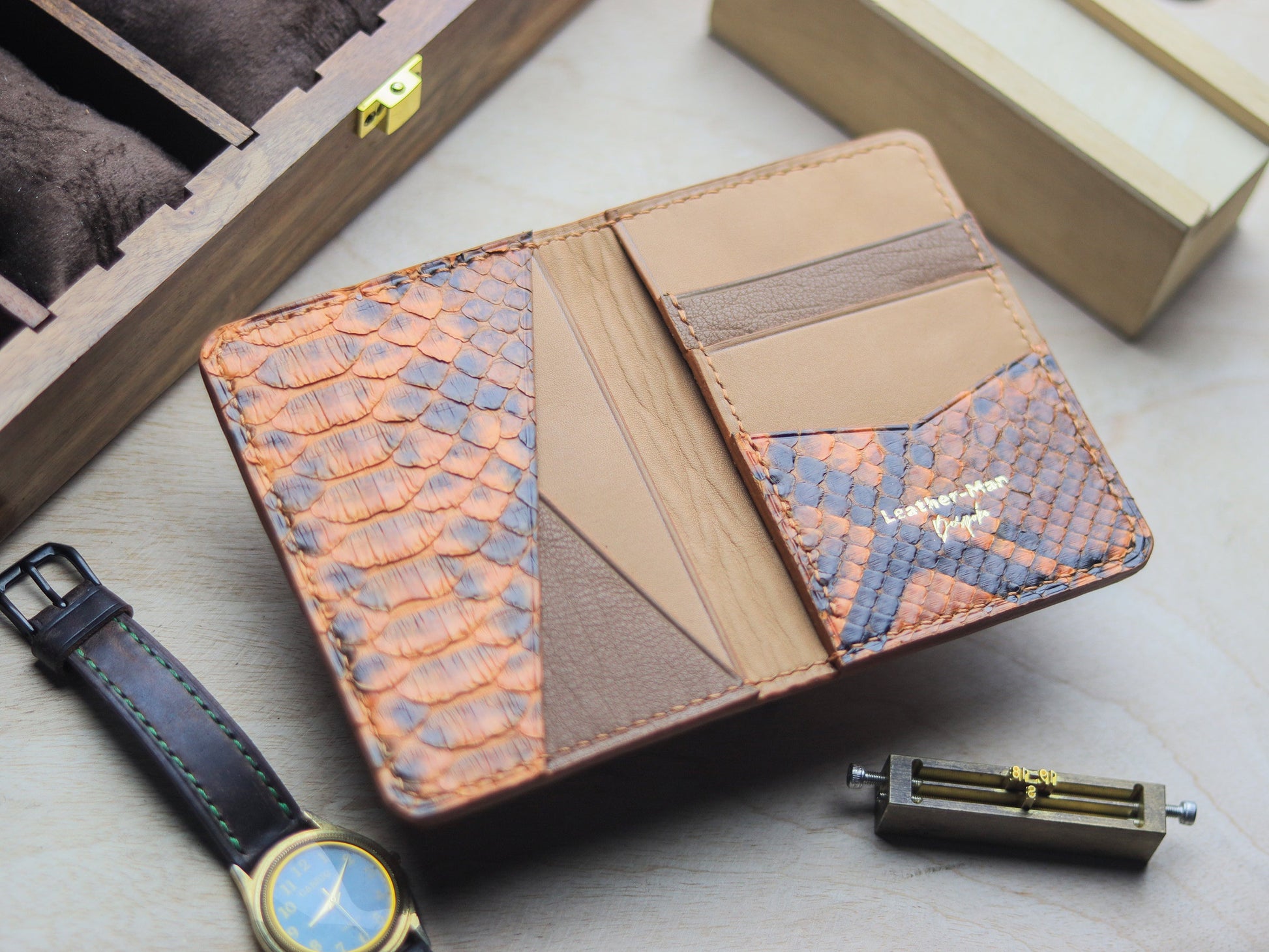 "Brixton" is our latest compact bi-fold card wallet. Crafted with grade A Real Python leather sourced from Vietnam & Indonesia. The inner leather is high quality Italian chevre goat skin. With thoughtful organization and high-quality materials, this custom leather wallet for men is as practical as it is stylish. It has 5 card slots and 2 bill slots. It is perfect to carry 8 to 10 cards with some cash.
