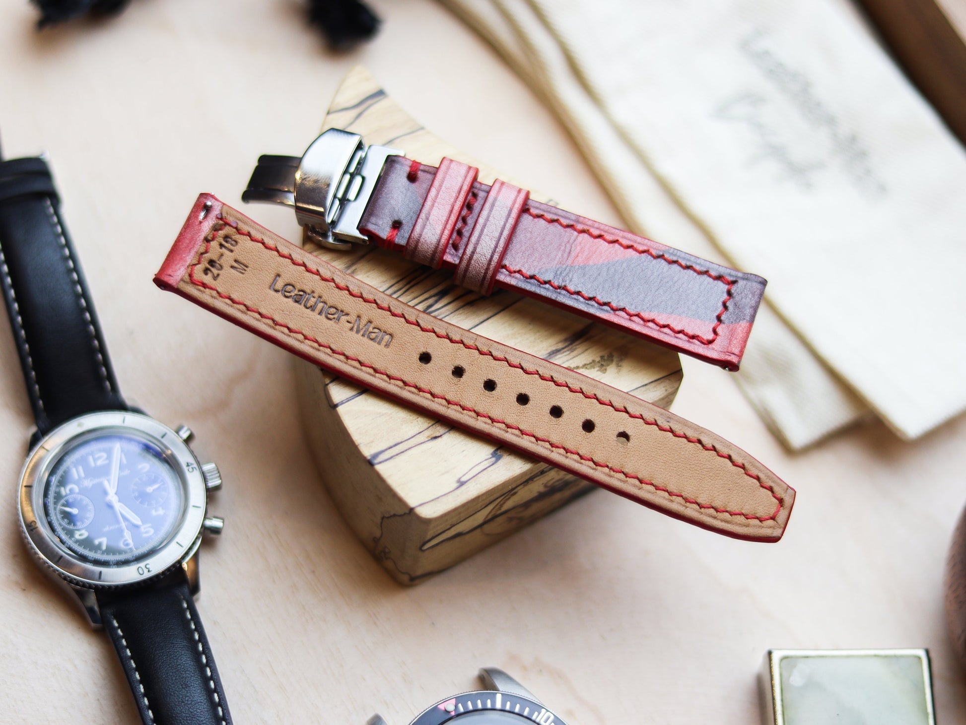 This exquisite handcrafted leather watch strap has a sleek and urban edge. Crafted from Premium Italian Waxed Camouflage Leather with precision and a passion for exceptional good looks. This leather and design blends urban sophistication with an enigmatic allure. The leather is smooth and ensures a comfortable fit. Elevate your wrist game.