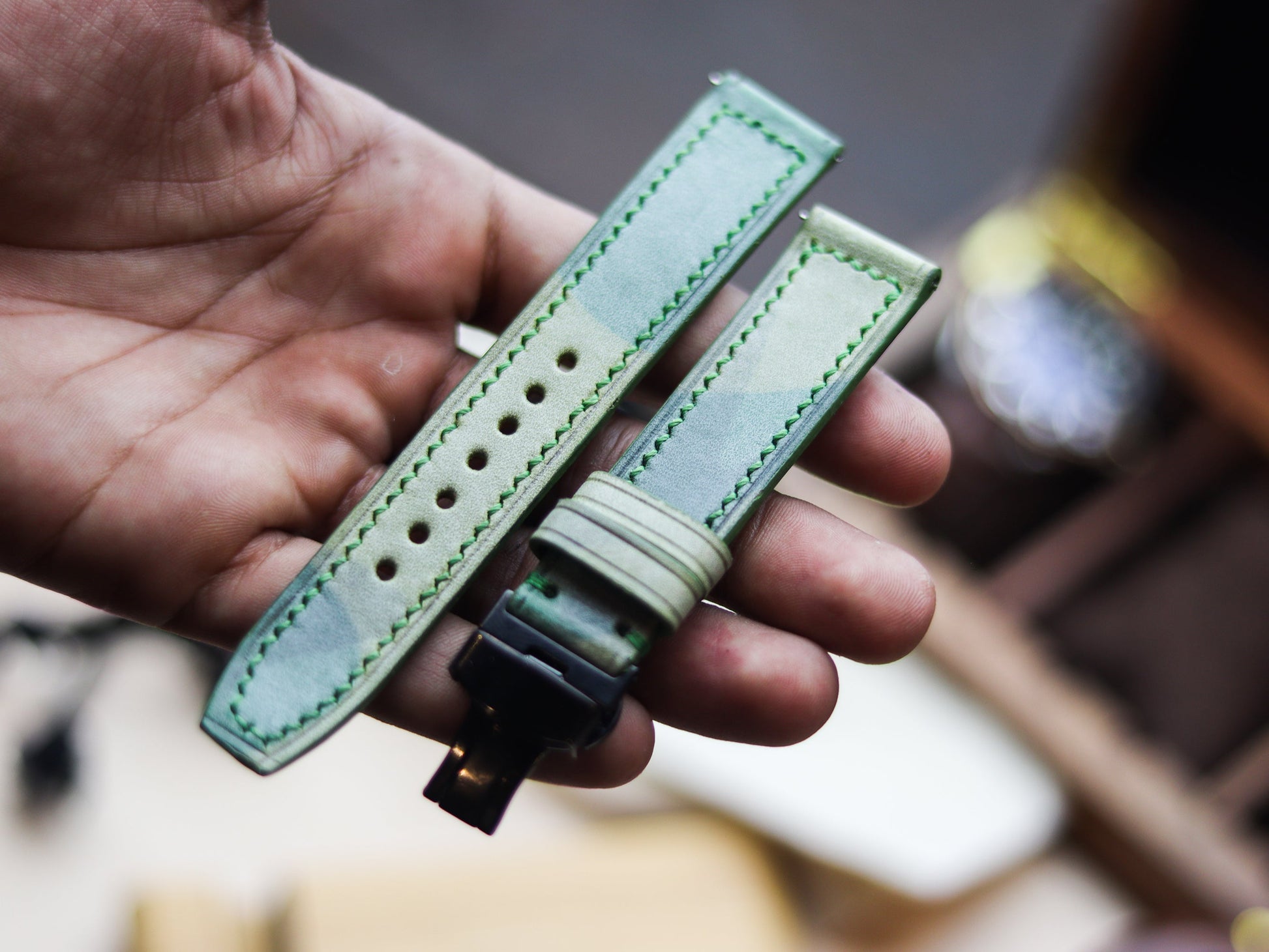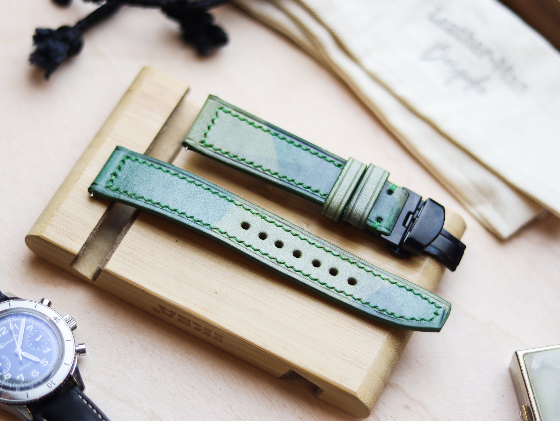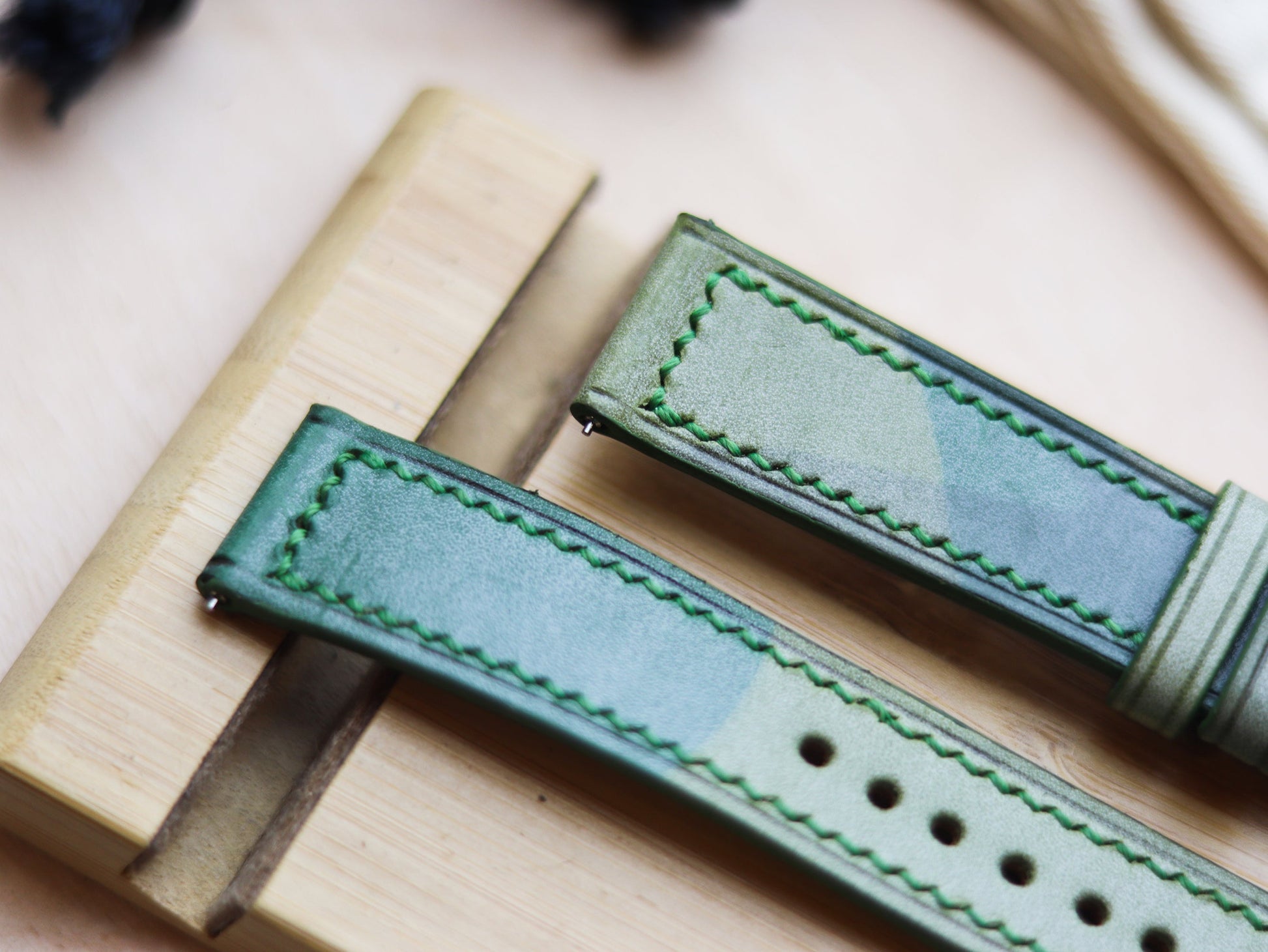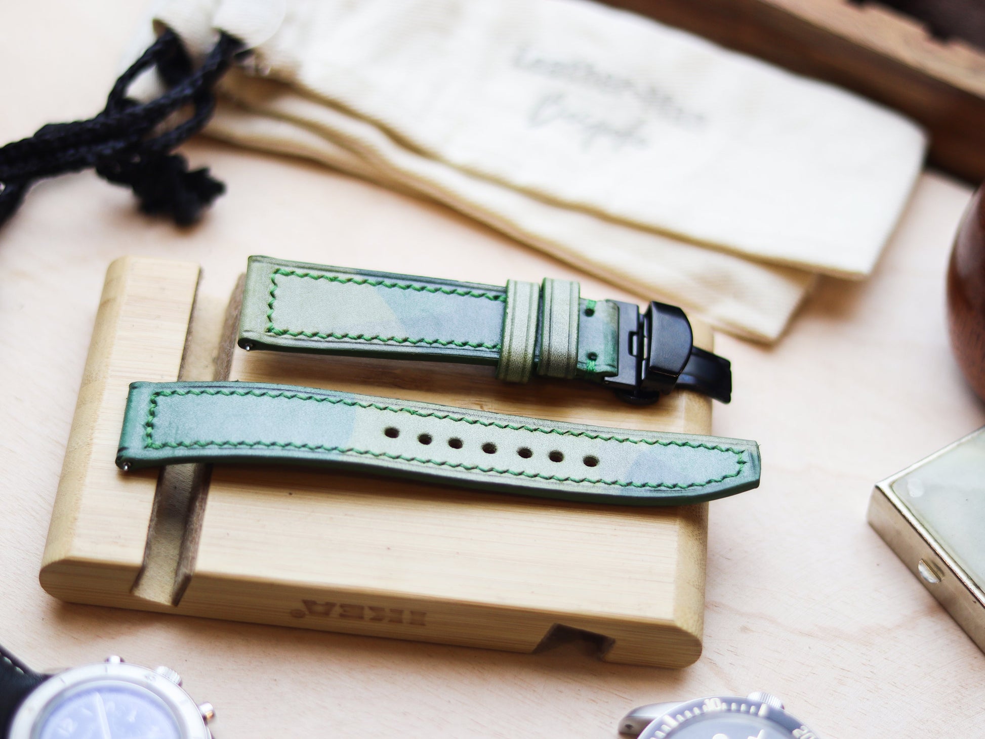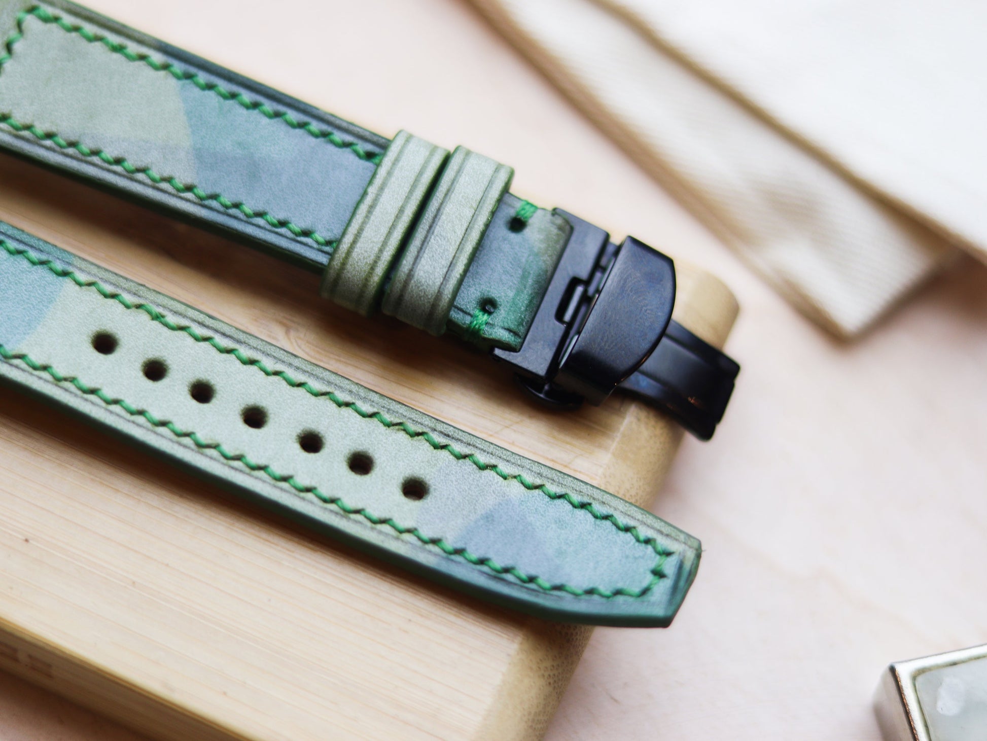 This exquisite handcrafted leather watch strap has a sleek and urban edge. Crafted from Premium Italian Waxed Camouflage Leather with precision and a passion for exceptional good looks. This leather and design blends urban sophistication with an enigmatic allure. The leather is smooth and ensures a comfortable fit. Elevate your wrist game.