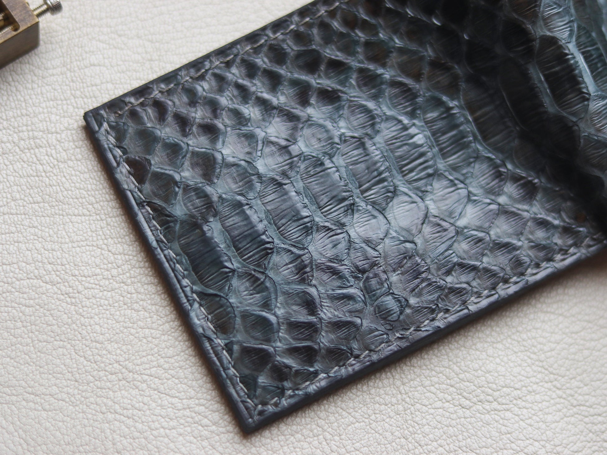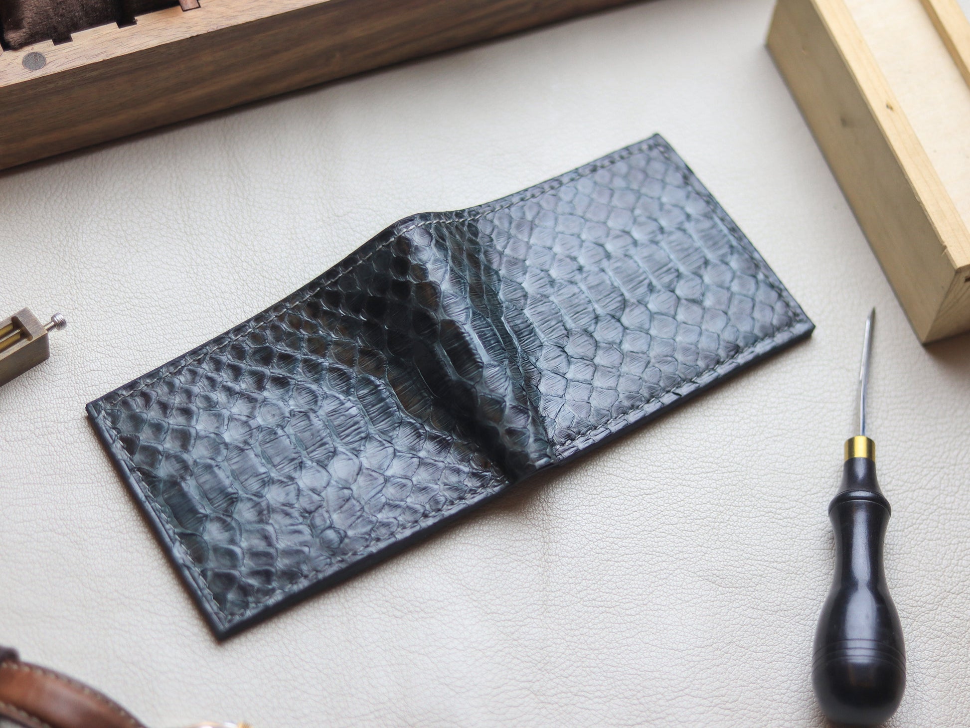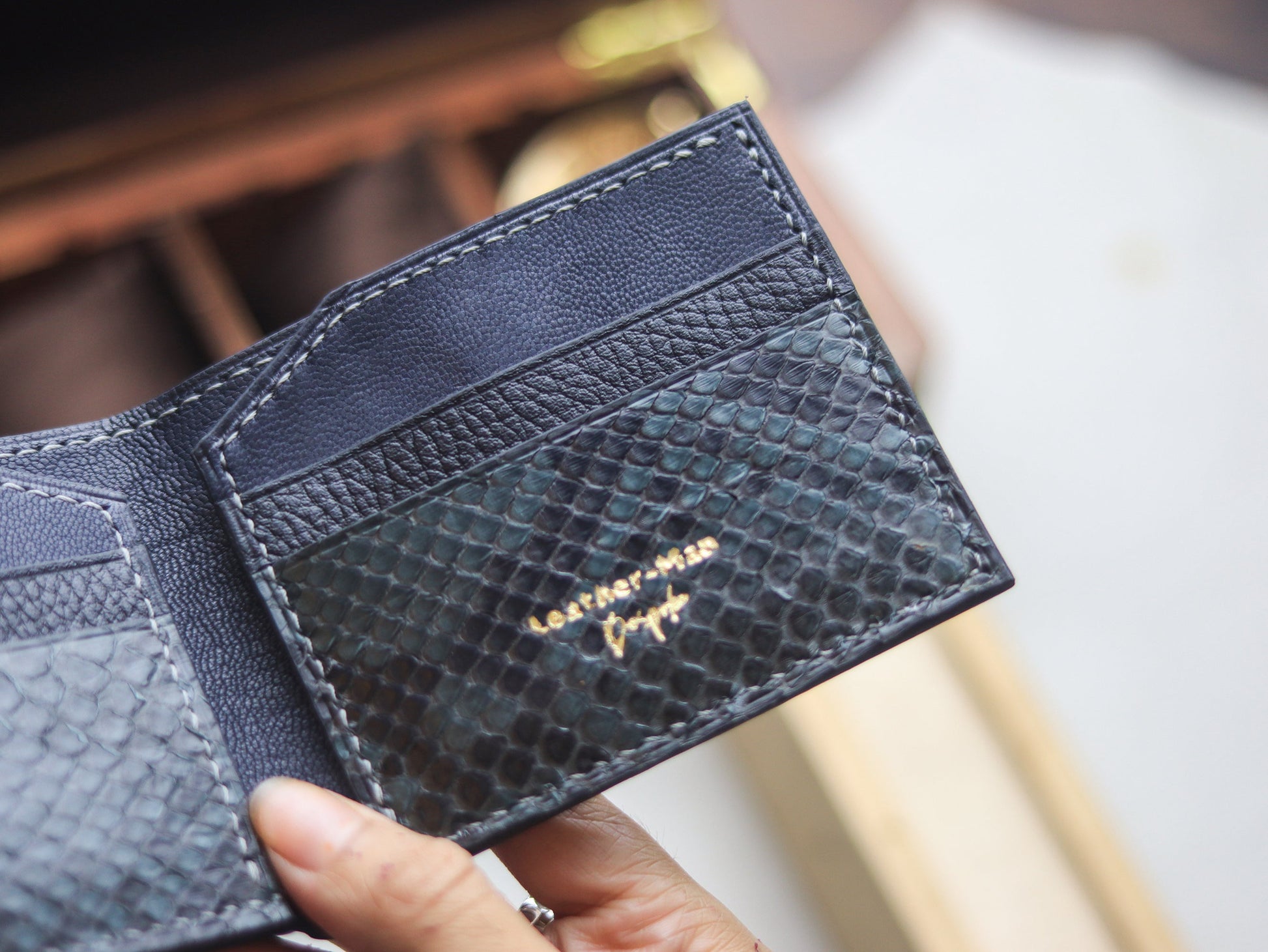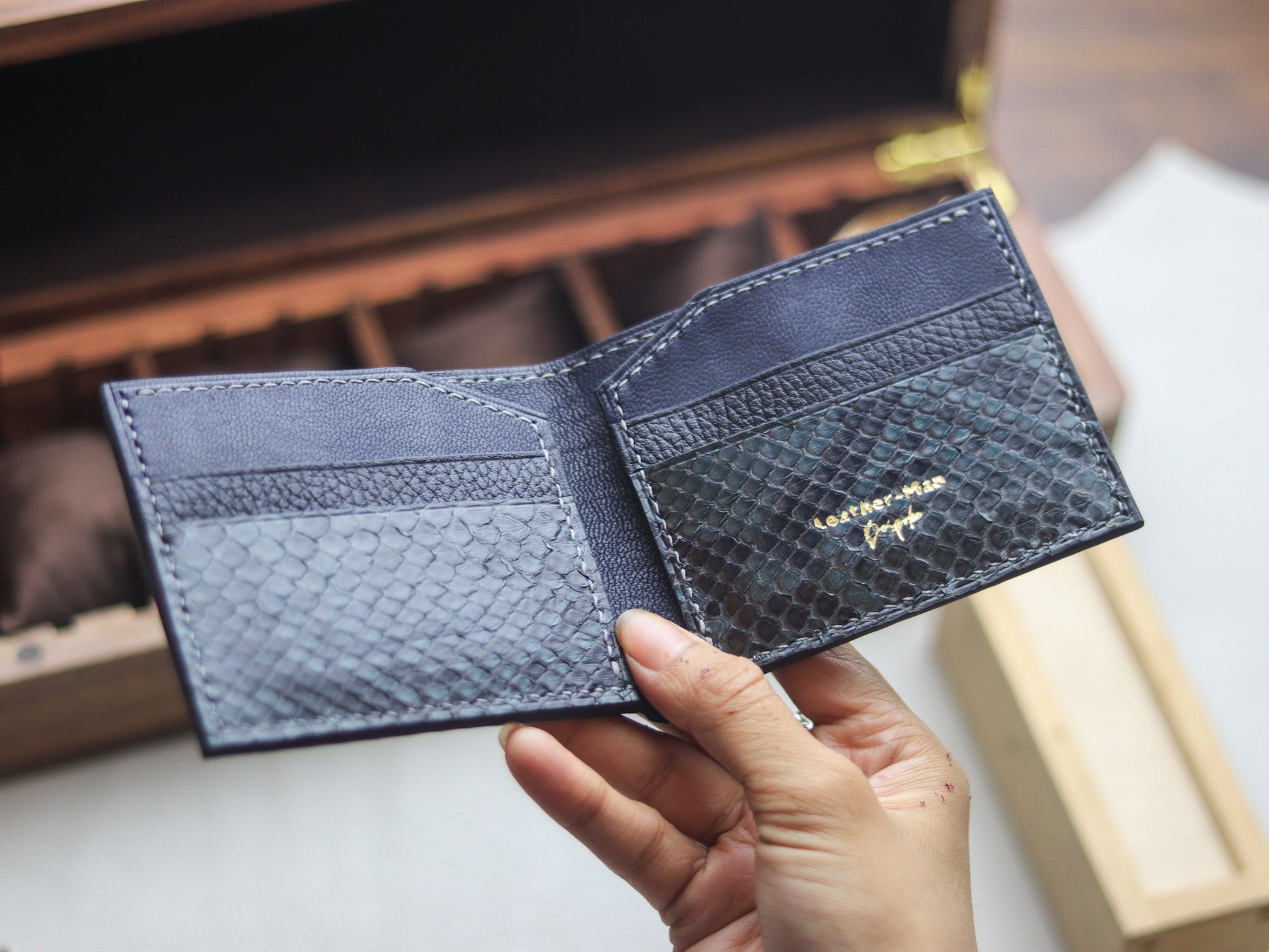 "Larson" is our latest men's bi-fold wallet. Crafted with grade A Real Python leather sourced from Vietnam & Indonesia. The inner leather is high quality Italian chevre goat skin. With thoughtful organization and high-quality materials, this custom leather wallet for men is as practical as it is stylish. It has 4 card slots, 2 hidden card slots and 2 bill slots. It is perfect to carry 8 to 10 cards with cash. Its unique design has an extra cash compartment.